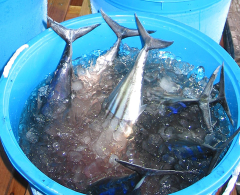 カツオの樽づめ。プラスチックの樽の中に、氷と海水を入れて、その中に血ぬきしたカツオを、頭を下にして入れます。これにより鮮度が保たれます。