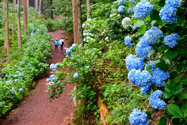 南沢あじさい山は東京都あきる野市の深沢地区にあるアジサイの名所です。南澤忠一氏が自らの所有する山に、およそ50 年をかけてたった一人でアジサイを植え続け、あじさい山を作り上げました。まさに現代の花咲か爺さんといえます。現在、アジサイの株は約1 万本に達し、紫や青、薄い緑などの色鮮やかなアジサイが、毎年咲き誇ります。