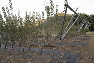 「ジョイント栽培」を導入した梅畑。梅の苗木と苗木を連結させ低く剪定する事で垣根のように仕立て、果実がたくさんできる木とできない木の勢いを均一化する事で早く実らせる栽培方法
