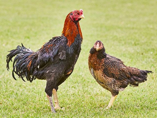 東京しゃもの雄と雌 写真提供 東京都農林水産振興財団 青梅畜産センター