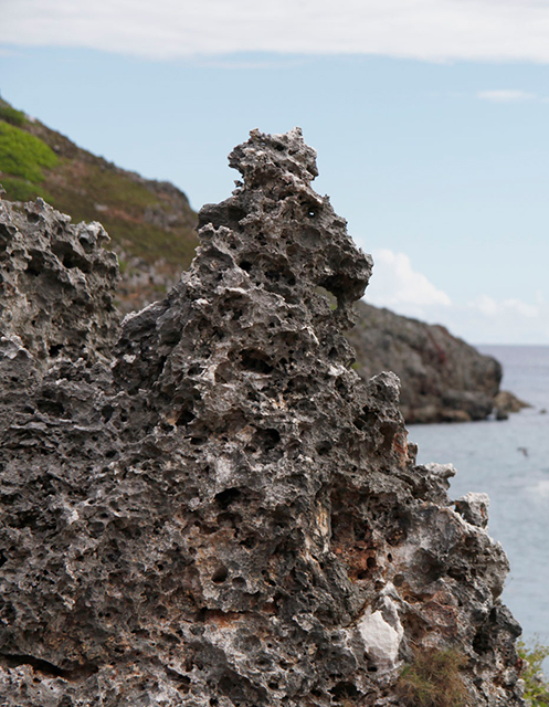 南島は、貴重な自然景観が観察できる無人島。小笠原諸島・父島の南西1kmの沖に浮かび、長さ約1.5km、幅約400mの石灰岩でできた沈水カルスト地形となっています。「カルスト地形」(Karst:ドイツ語)とは、石灰岩などが雨水や地下水により溶解・侵食されてできた地形のことで、「沈水カルスト地形」はそのカルスト地形が海中に沈下したもの、もしくは沈下しつつあるもののこと。南島や母島の石門一帯などに見られ、日本では珍しい地形で、国の天然記念物に指定されています。