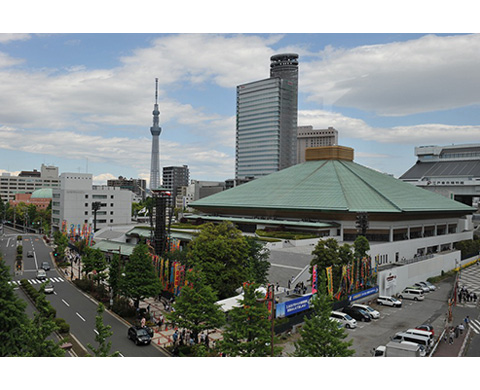 両国(りょうごく)国技館墨田区 大相撲の殿堂です。昭和60年、新国技館として両国(りょうごく)に復帰しました。毎年1月、5月、9投信月には本場所が行われています。また、毎年2月には、「5,000人の第九コンサート」も開催されています。